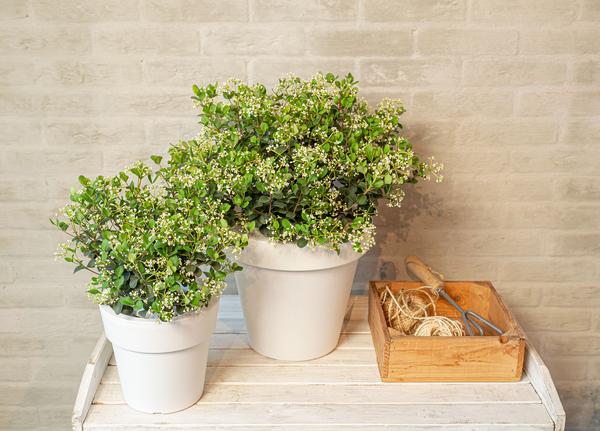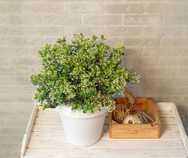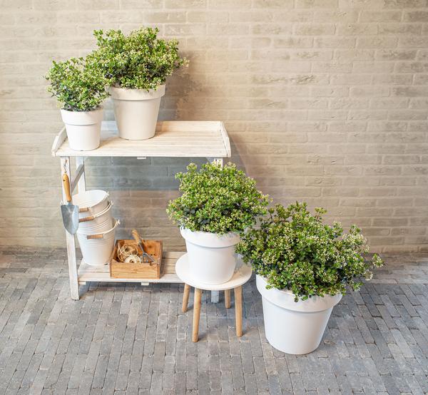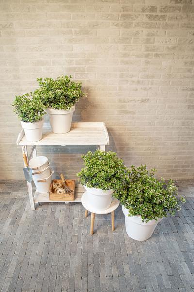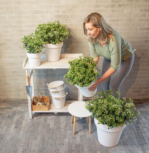 De Viburnum ‘Fairy Stars’ is een groenblijvende struik met ronde blaadjes. Ze bloeit eind mei en juni met witte bloemschermpjes die later in het jaar uitgroeien tot blauwzwarte besjes. Uit zichzelf wordt deze opvallende plant met gemak 150 cm hoog, maar je kunt dit familielid van de sneeuwbal heel goed snoeien, ze laat zich goed tot een bol of zelfs een haag vormen. Geef de plant een halve dag zon of meer. Een wat beschutte plaats wordt gewaardeerd. Meng lekker veel potgrond door het plantgat want ze is dol op wat zuurdere grondsoorten.