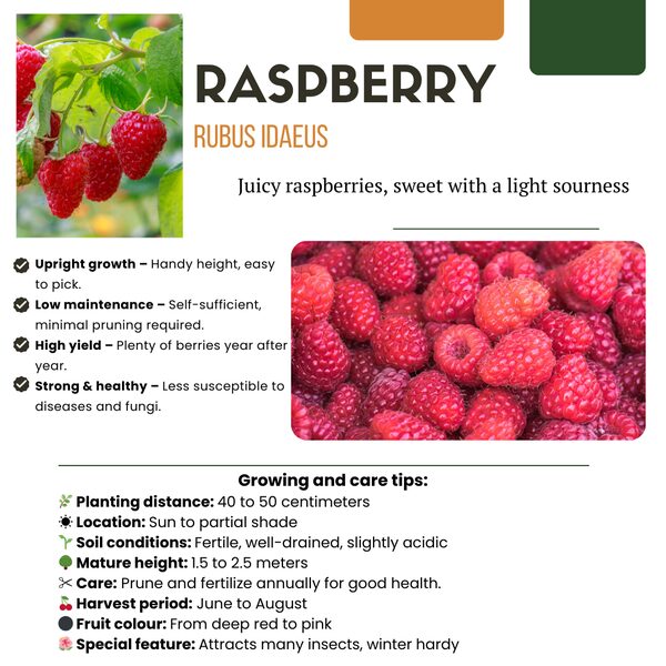 Rubus idaeus (Framboos): Geniet van de zoetheid van verse frambozen, ideaal voor het maken van jams, desserts of gewoon als een lekkere snack uit de tuin.