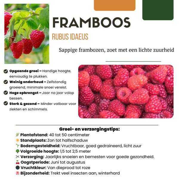 Rubus idaeus (Framboos): Geniet van de heerlijke, zoete frambozen die zowel in zon als halfschaduw uitstekend gedijen. Ze zijn perfect voor direct gebruik of voor het maken van jams en desserts.