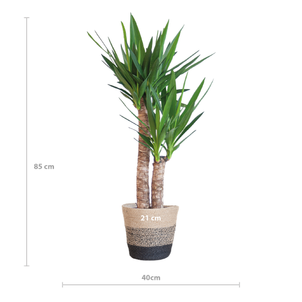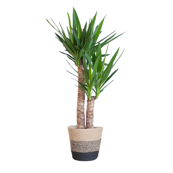 De Yucca, ook wel bekend als Palmlelie, is een indrukwekkende groene kamerplant met lange, stevige, zwaardvormige bladeren. Deze bladeren geven de plant een stoere en robuuste uitstraling, waardoor hij een echte blikvanger is in elk interieur.