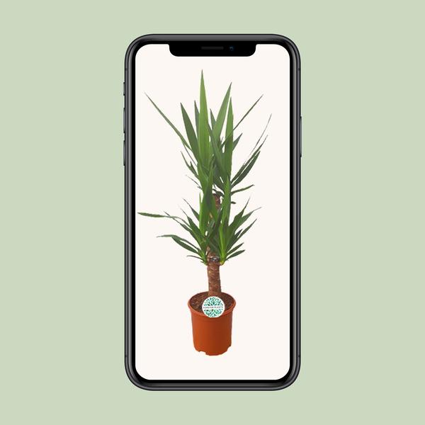 - De huidige hoogte van deze Yucca is ongeveer 90 cm, wat direct impact geeft in elke ruimte.